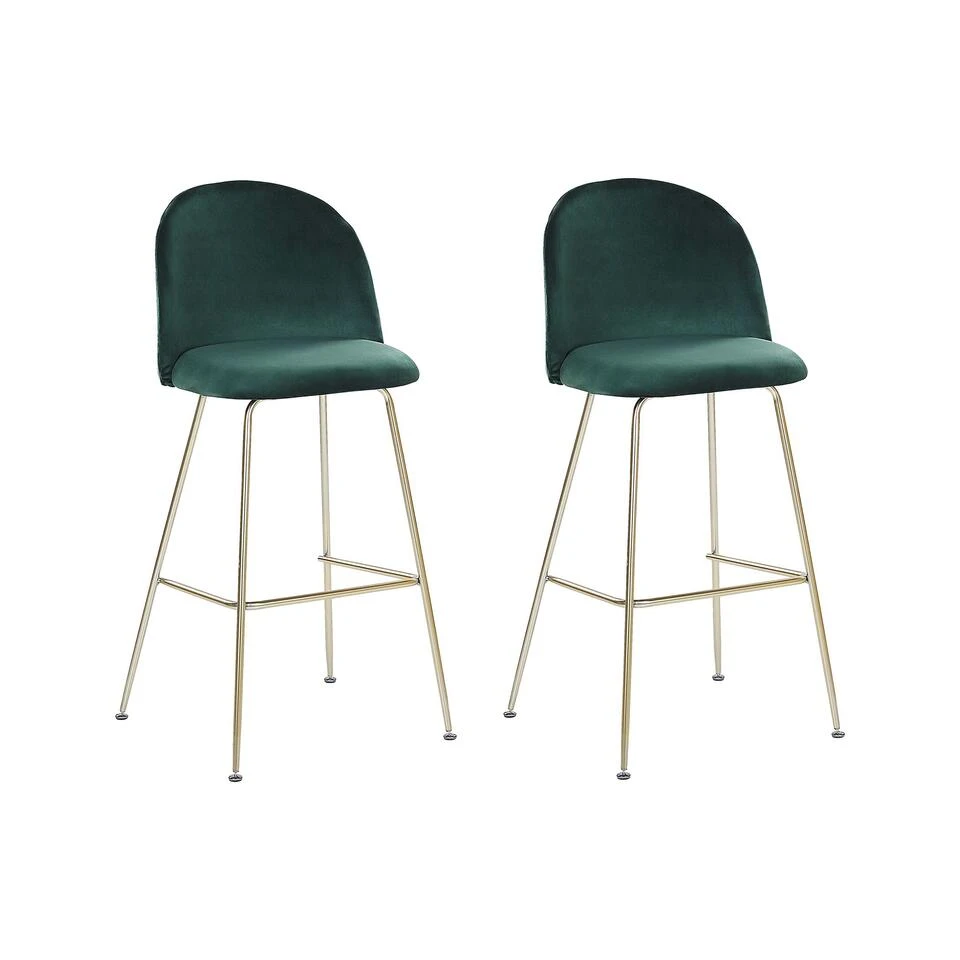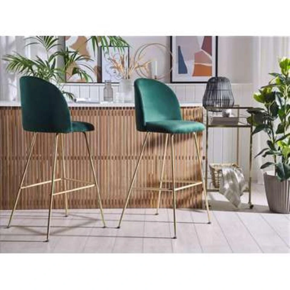 Stijlvolle, fluwelen barkruk in groen. De comfortabele, gestoffeerde zitting en de ronde rugleuning zijn bekleed met een prettige fluwelen stof, die dankzij de licht glanzende, donkergroene kleur een zeer stijlvolle indruk maakt. Het glamoureuze gevoel wordt benadrukt door het glanzende, gouden frame. Of je nu een kookeiland of een bar in huis hebt, deze barkrukken geven elk interieur een chique accent.
