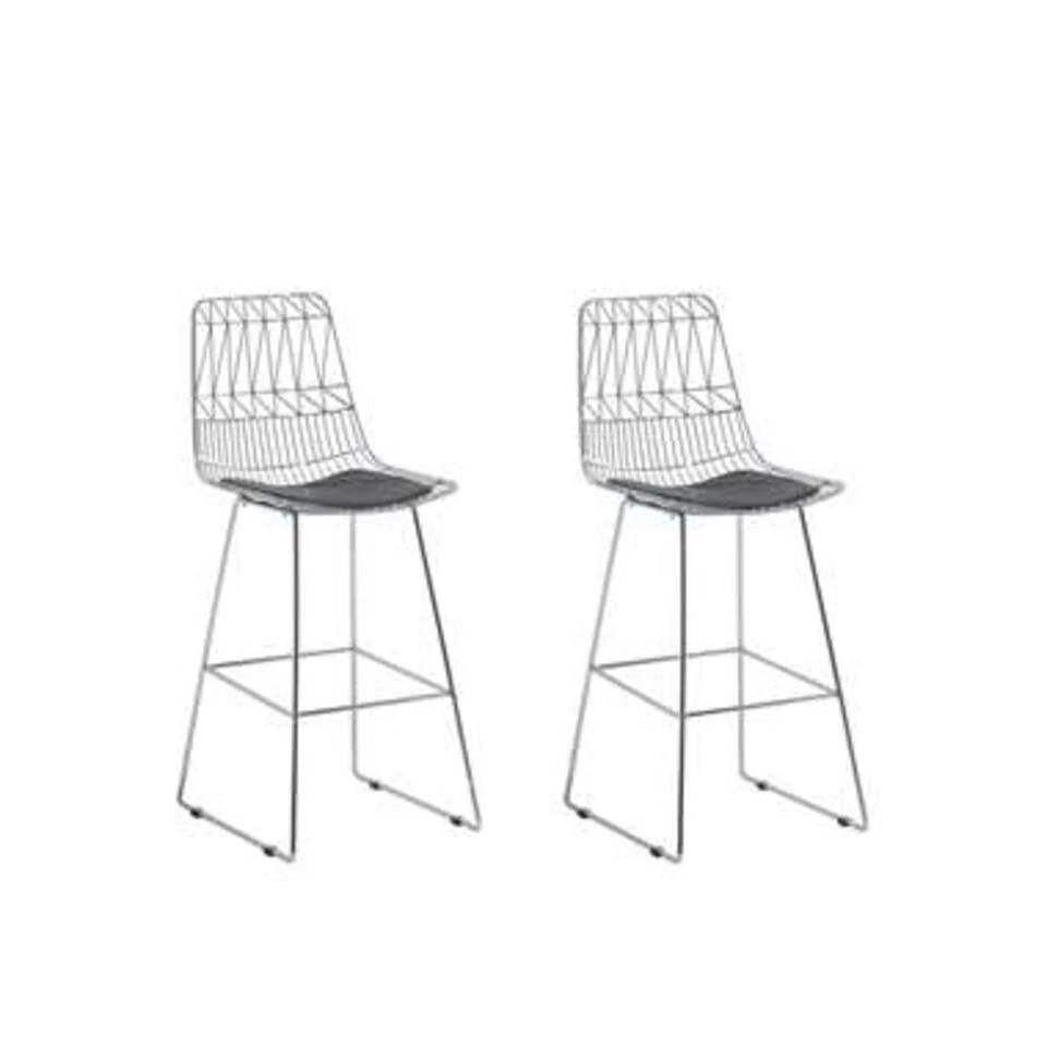 Barkrukken van zilver metaal in een praktische set van 2. De zithoogte, de comfortabele grijze kunstleer kussens en de praktische balken die dienen als voetsteunen maken deze moderne barkrukken een ideale keuze voor een bar of aanrecht. Dankzij hun slanke vorm en de uitgebreide, open structuur van de rugleuningen zijn ze een visueel hoogtepunt. Vanwege het robuuste materiaal zijn de barkrukken geschikt voor gebruik binnens- en buitenshuis, maar ze moeten altijd droog en beschermd worden gehouden.