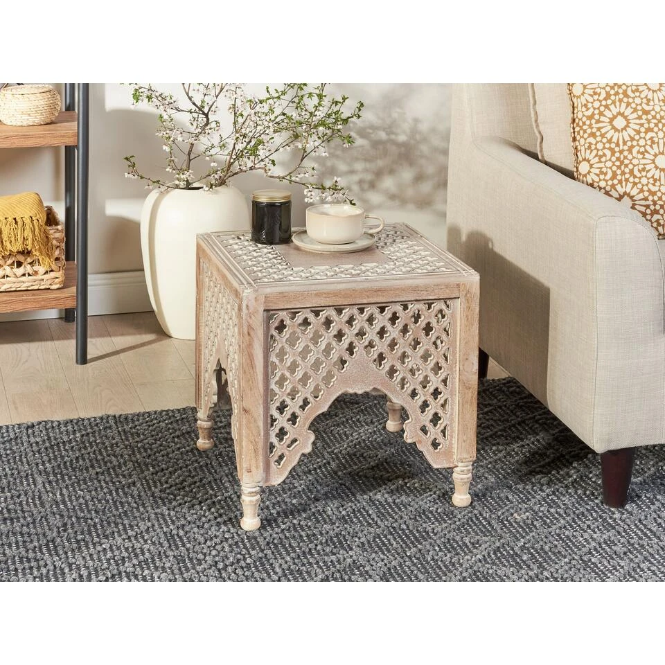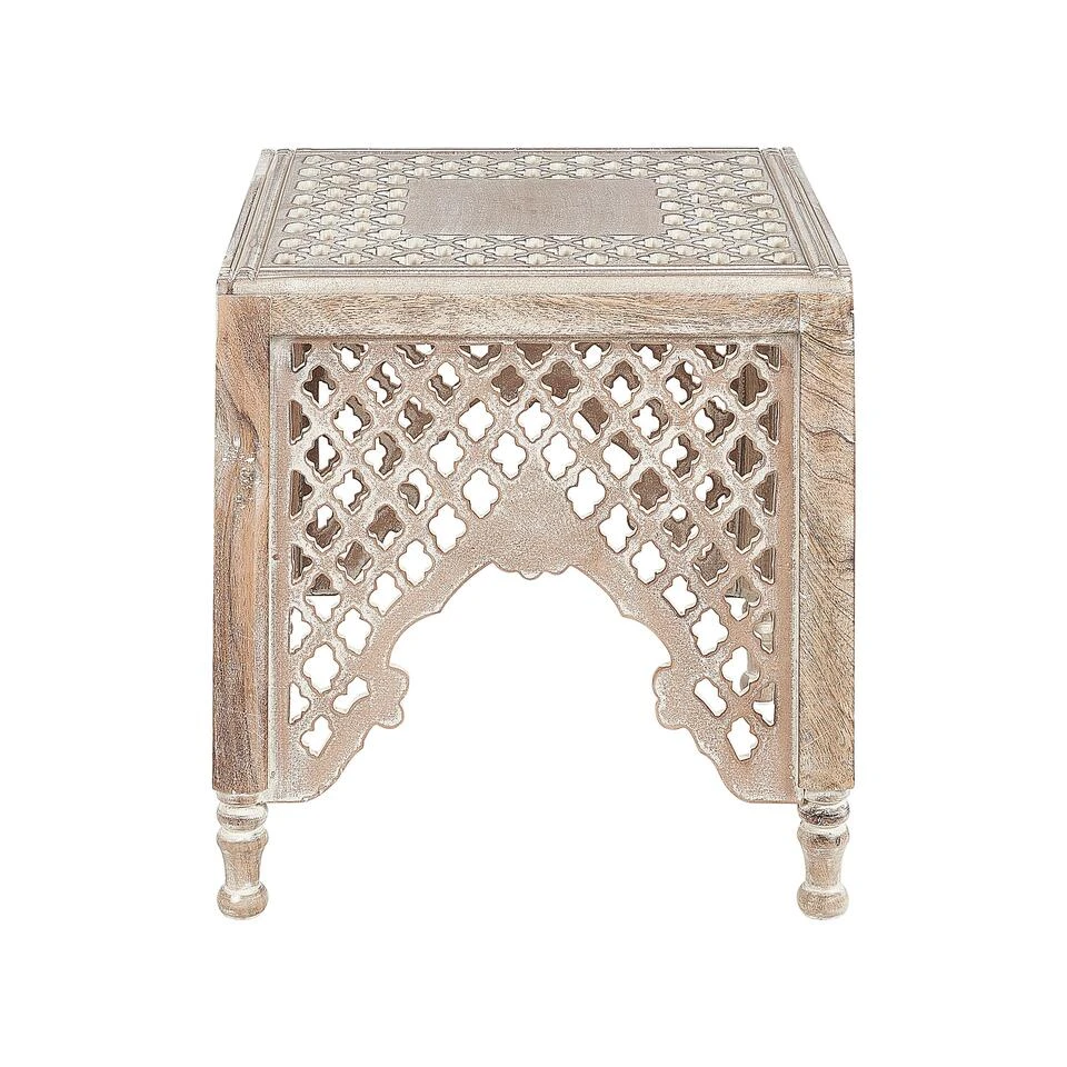 Handgemaakte Oosterse bijzettafel. Breng een oosterse sfeer in je interieur met deze handgemaakte bijzettafel. Het stuk is gemaakt van duurzaam mangohout en hoogwaardig MDF – beide materialen zorgen ervoor dat het lang meegaat en tegelijkertijd onderhoudsarm is. Dankzij het ruime blad kun je er verschillende decoraties, borden of drankjes op plaatsen. Dankzij het unieke ontwerp en het feit dat de tafel handgemaakt is, zal het product opvallen in je huis en zeker de aandacht trekken van al je gasten.