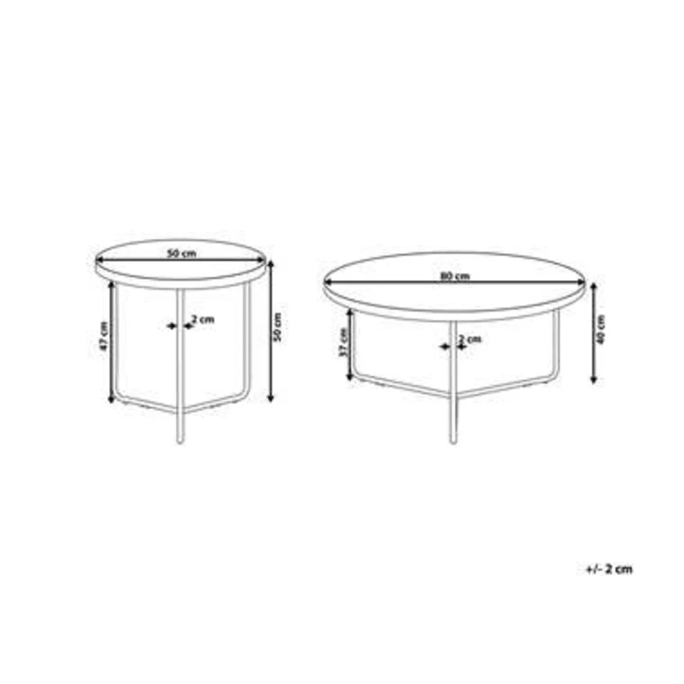 Moderne, twee-delige salontafelset. Geef je woonkamer een modern karakter en creëer een stedelijke sfeer met deze industrieel-geïnspireerde 2-delige salontafelset. Het ronde tafelblad in een lichte houtkleur is de perfecte plek om kaarsen, planten en foto’s te presenteren of warme dranken aan gasten te serveren. De multifunctionele set bestaat uit twee bijzettafels in verschillende maten (medium en groot). De meubels kunnen worden gebruikt als nachtkastjes of als een accent in de hal.