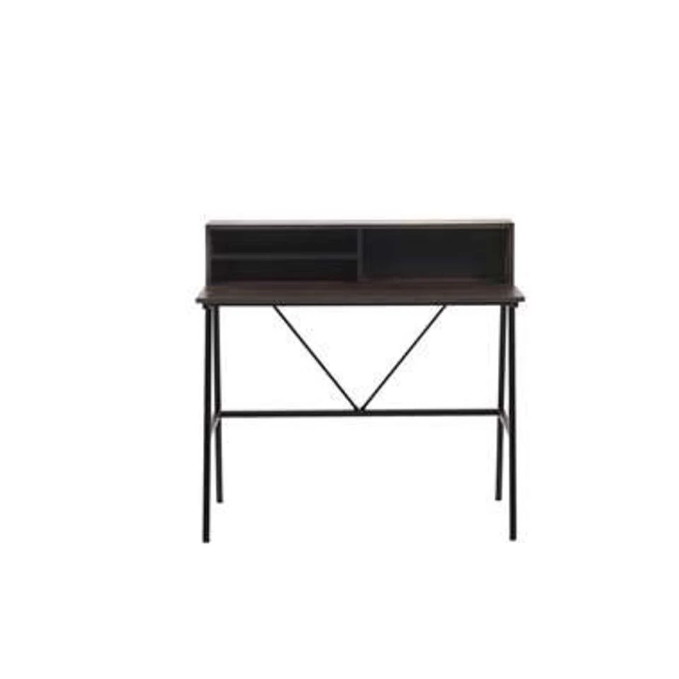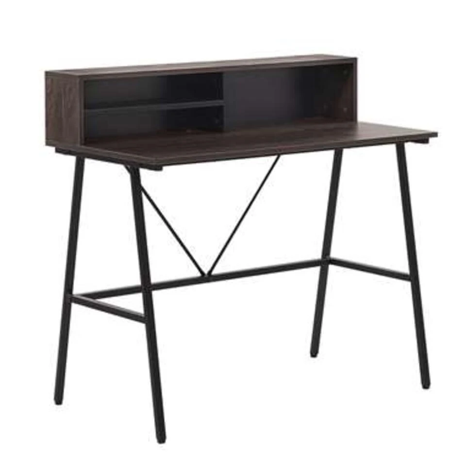 Minimalistisch bureau in donkerbruin met opbergruimte. Dit bureau is enorm elegant, met daarnaast voldoende ruimte voor je boeken en schrijfgerei door middel van een open compartiment met een kleine plank. Het minimalistische design past perfect in moderne woonstijlen en neemt door zijn afmetingen weinig ruimte in beslag, zodat je ook in kleinere ruimtes een werkhoek kunt inrichten.