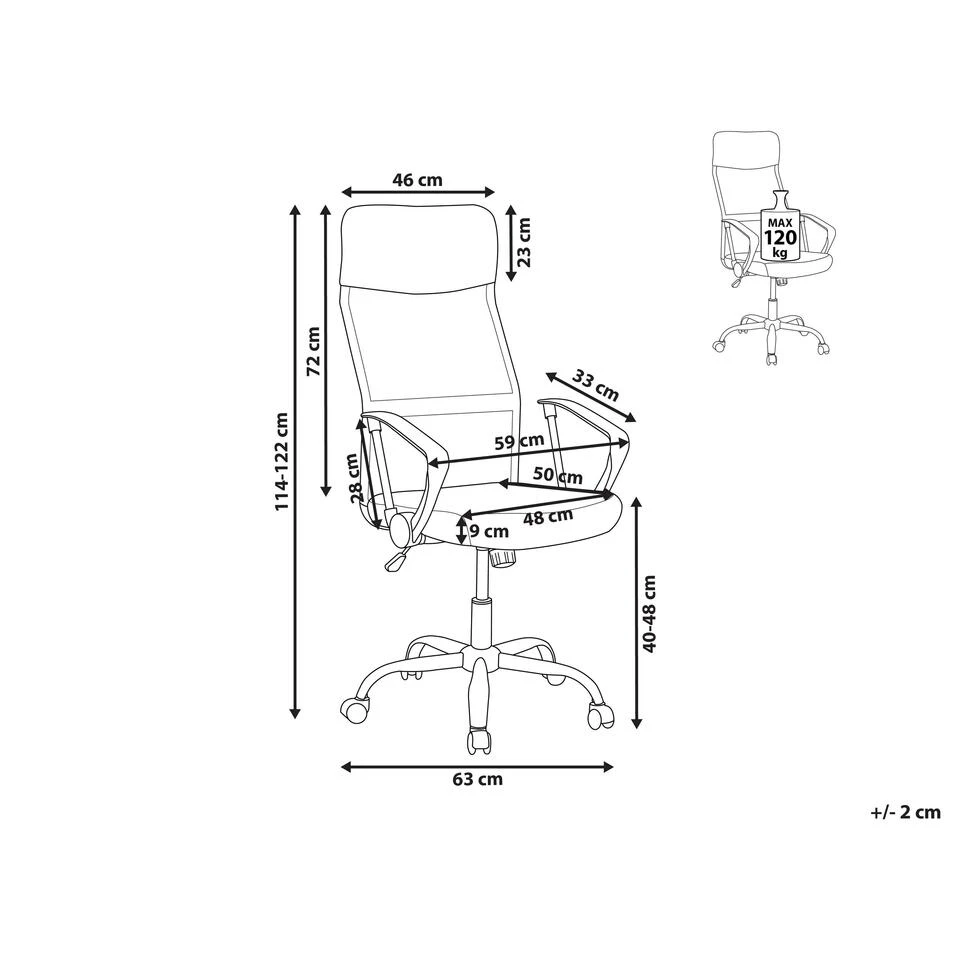 Executive bureaustoel met hoge rugleuning. Deze kantoorstoel met een ergonomisch ontwerp biedt ondersteuning voor je lichaam tijdens lange werkdagen. Met de verstelbare zithoogte, 360° draaibaarheid en het kantelmechanisme kun je de stoel aan passen aan jouw comfort. De metalen, verchroomde basis is voorzien van 5 soepel rollende wieltjes. De dik gevoerde zitting is bedekt met een doorlatende mesh-stof, met hoogwaardig kunstleer op de hoofdsteun.