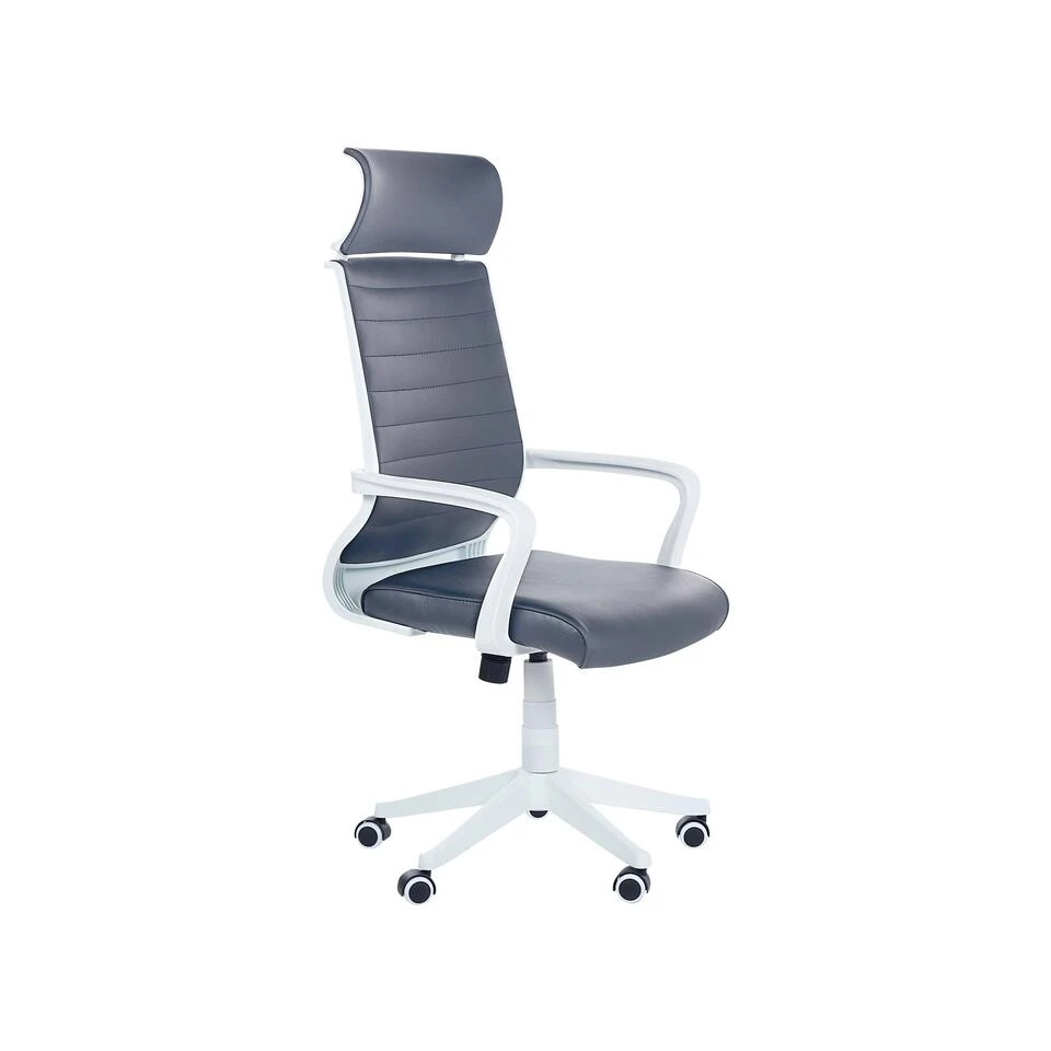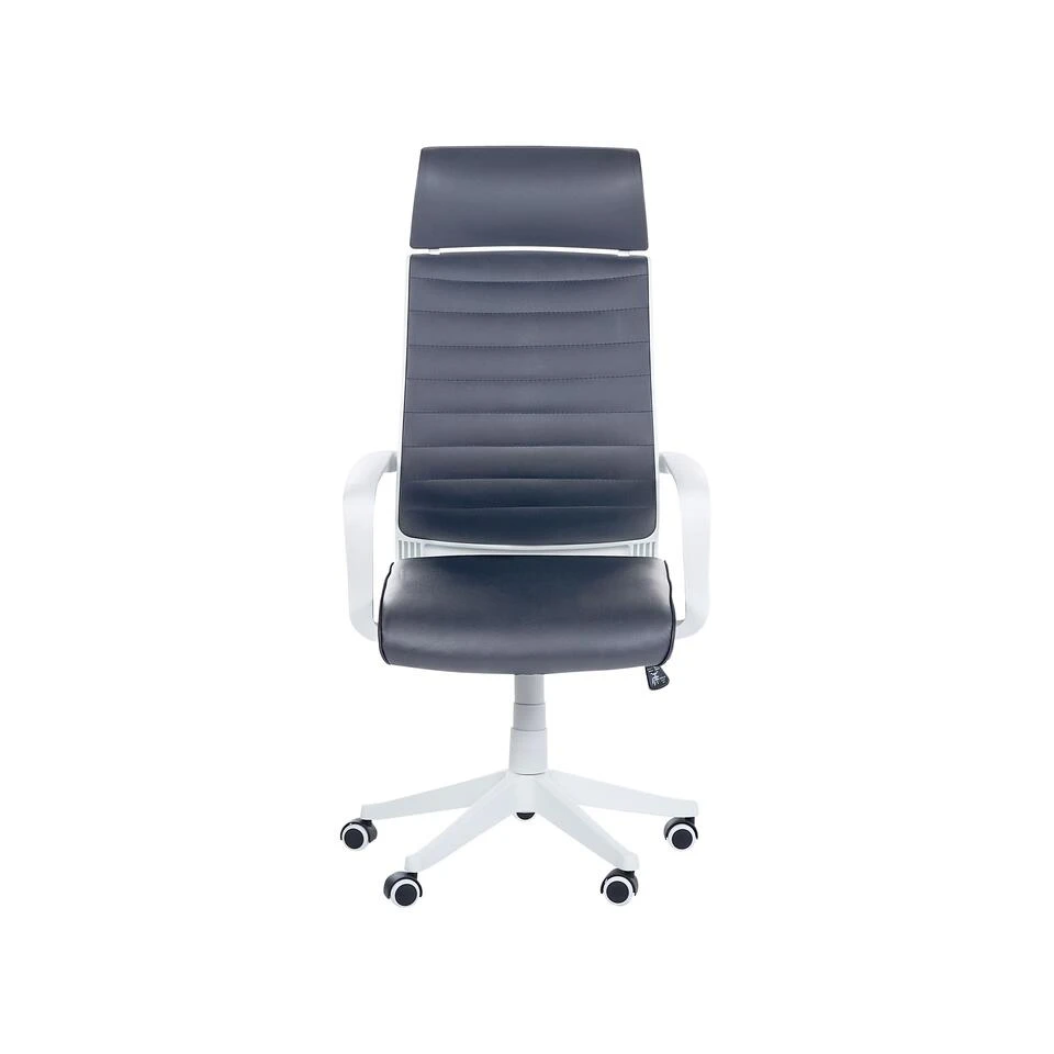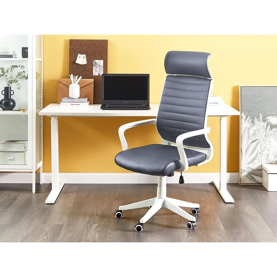 Moderne bureaustoel met hoge rugleuning. Maak je werkkamer of kantoor comfortabeler met deze bureaustoel met hoge rugleuning. Deze stoel past perfect bij elke moderne of minimalistische inrichting. De rugleuning is gemaakt van gemakkelijk te onderhouden polyester mesh stof. Het kantelmechanisme en de verstelbare zithoogte zorgen ervoor dat de stoel comfort biedt tijdens lange uren werken of gamen. De nylon wielen rollen soepel over de vloer, zonder krassen achter te laten. Dankzij het stevige metalen frame biedt de stoel stabiliteit en jarenlang gebruiksgemak.