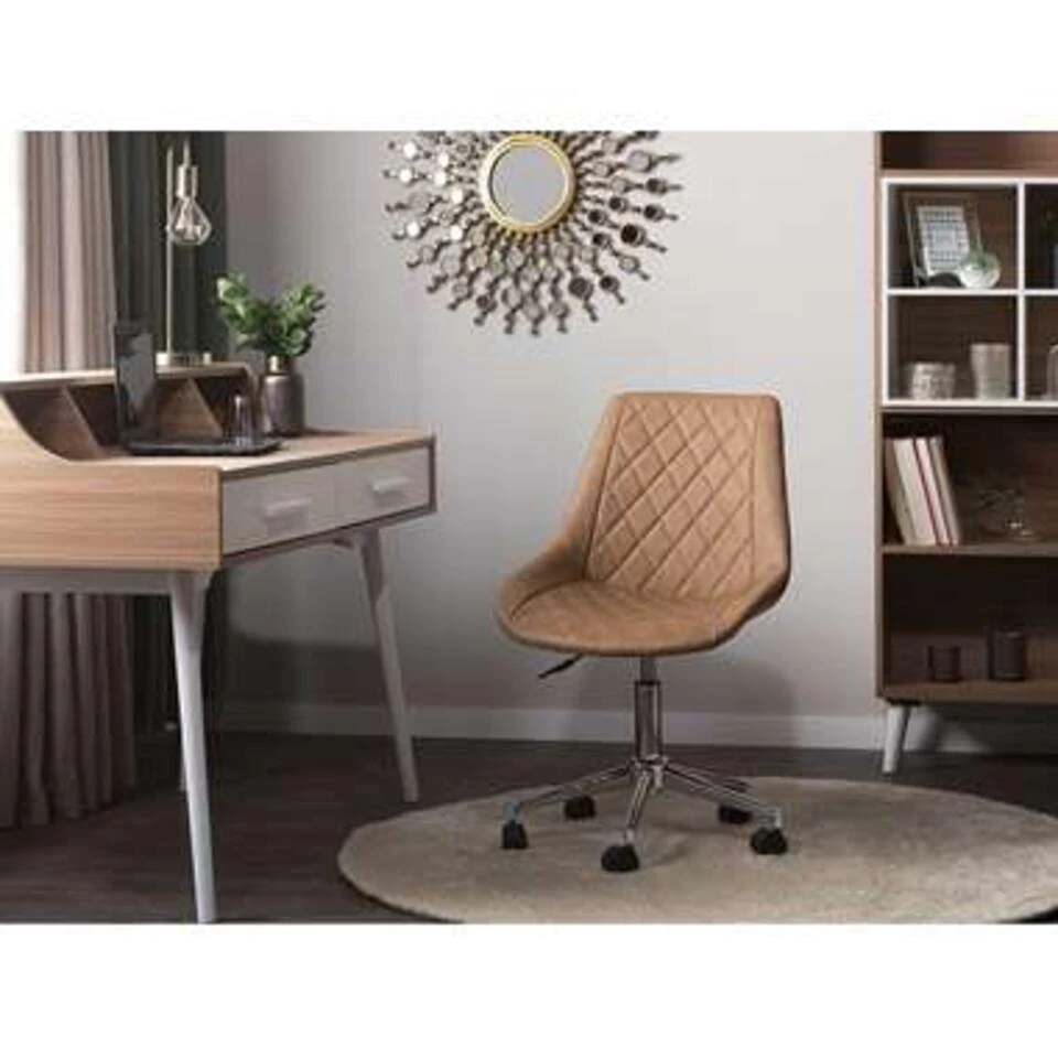 Moderne bureaustoel van bruin kunstleer. Breng een stijlvol element aan in je thuiskantoor. Deze bureaustoel is perfect in traditionele en moderne interieurs. Dankzij het ontwerp past het bij verschillende inrichtingsstijlen en kleurenschema’s. Deze verplaatsbare stoel heeft een zachte schuimvulling en een hendel die zorgt voor een comfortabel gevoel tijdens lange computersessies.