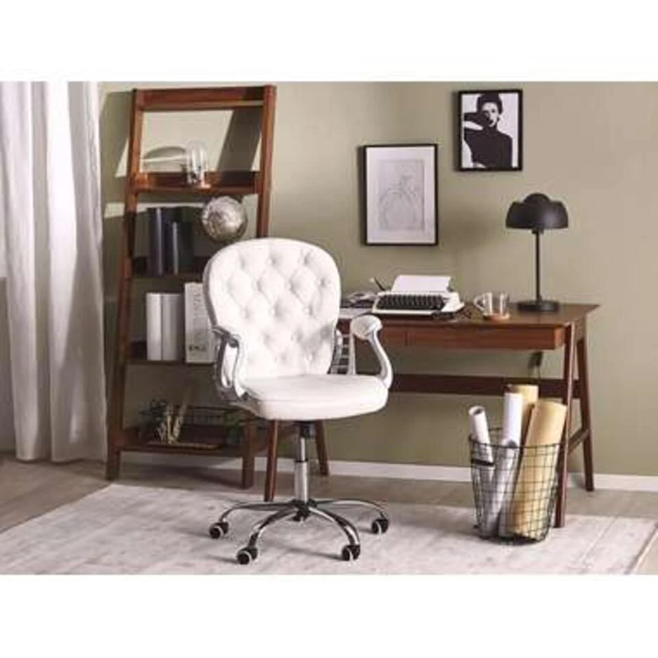 Draaibare, elegante bureaustoel. Deze luxe stoel combineert een moderne look met een vintage accent. Door de afgeronde, gevulde armleuningen is het comfort verzekerd. Een geïntegreerd draaimechanisme en een gaslift zorgen voor een totale aanpassing aan je figuur. Kortom, een veelzijdige optie voor verschillende kantooromgevingen.