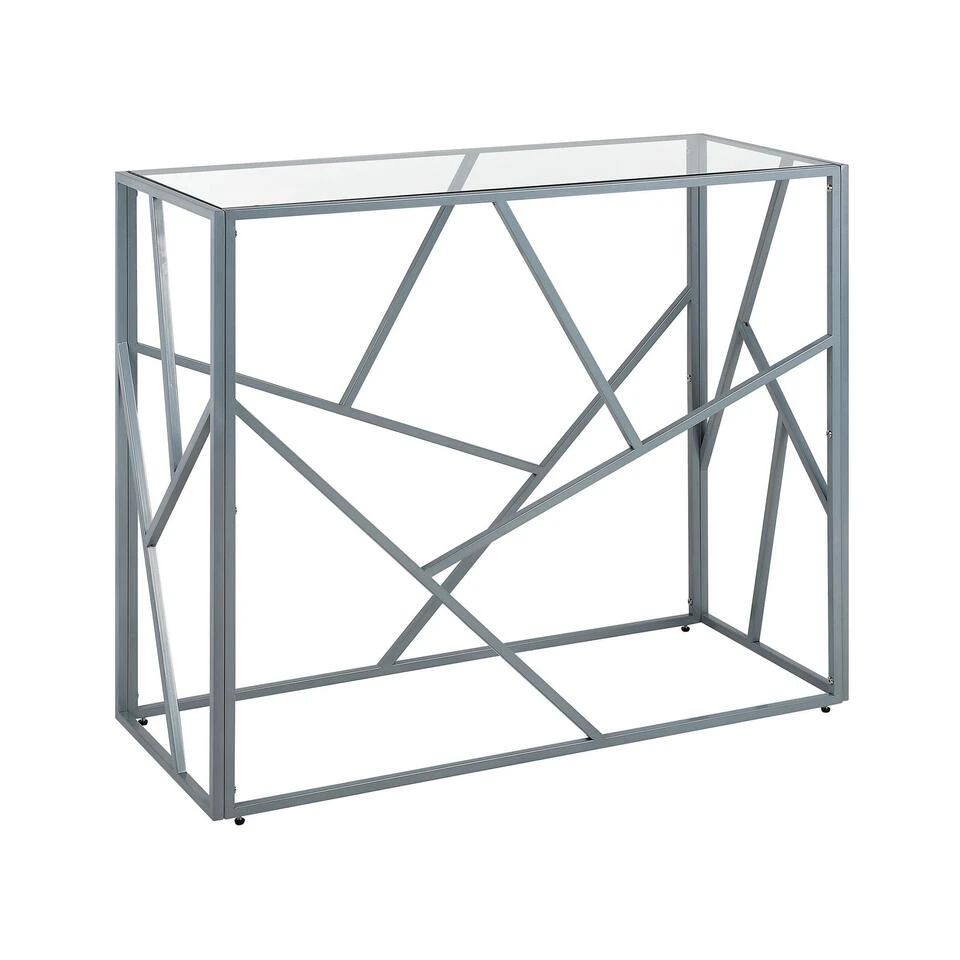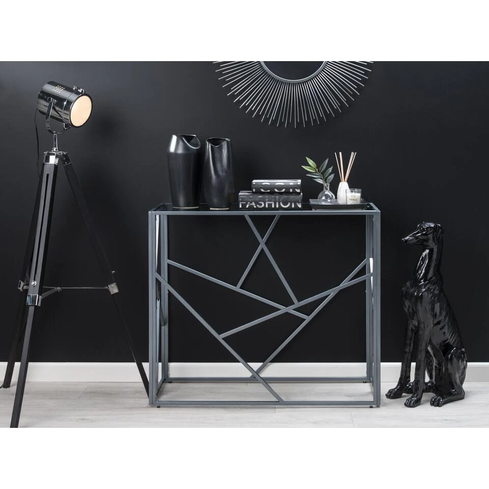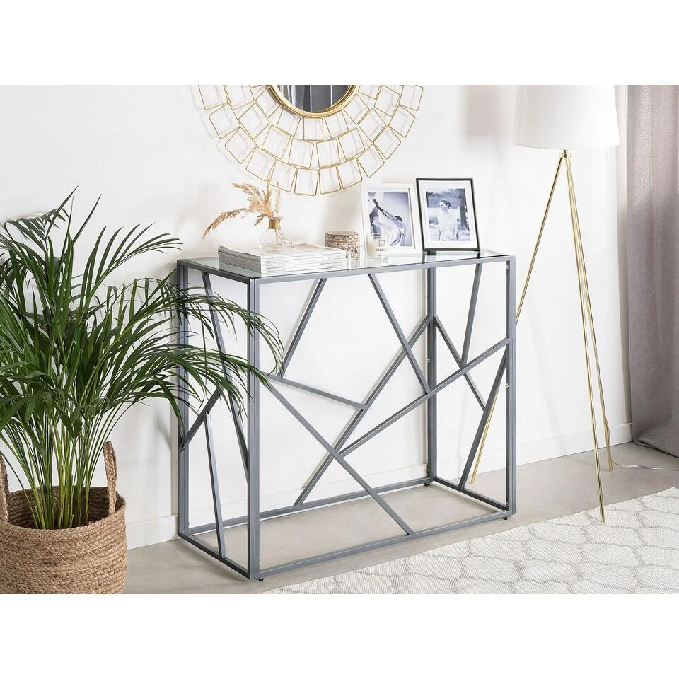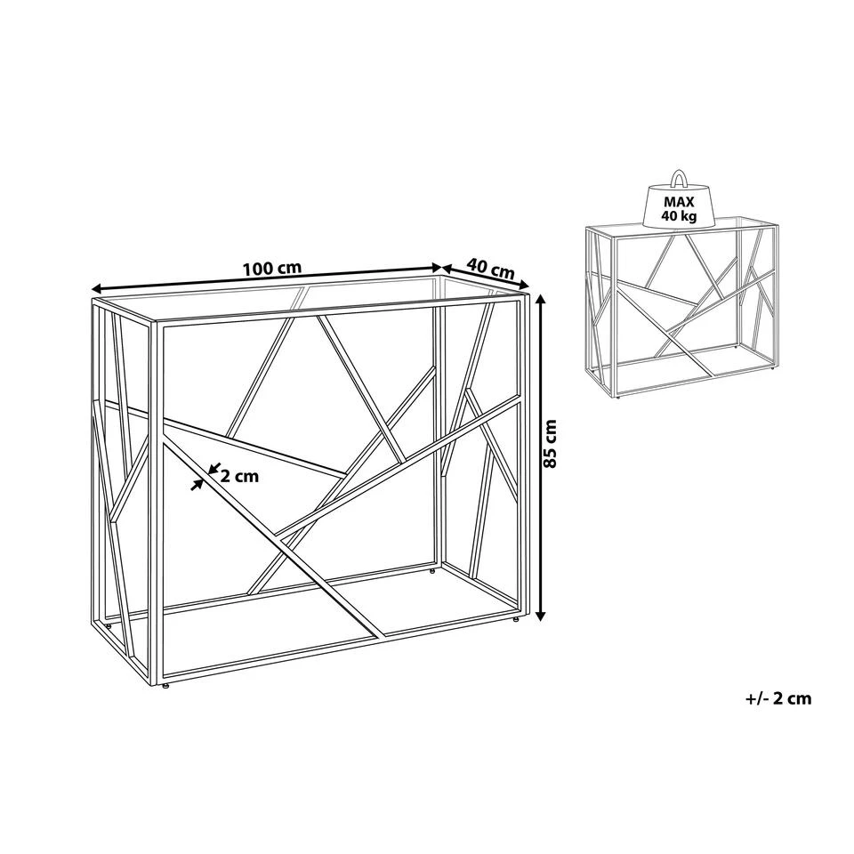 Functionele sideboard in industriëel design. Met een modern en industrieel geïnspireerd ontwerp zal deze consoletafel zeker niet ongezien kunnen gaan. Het geometrische metalen frame en het glazen tafelblad creëren een uitstekende compositie – een briljante pasvorm voor een moderne woonkamer of hal. De tafel is voorzien van beschermpads, zodat u hem kunt verschuiven zonder vrees voor beschadiging van de vloer.