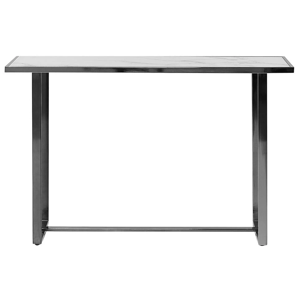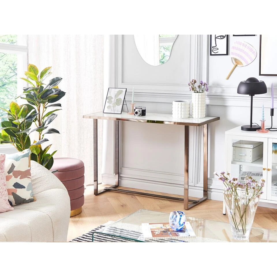 Glamoureuze kaptafel met glazen blad met marmereffect en zilverkleurige metalen poten. Geef je interieur allure met deze glamoureuze console. De afwerking met gehard glas en marmer geeft het stuk elegantie. Dankzij de metalen voet is het meubel stabiel en de glanzende afwerking vult het hele ontwerp aan. Plaats het in je woonkamer, slaapkamer of hal en toon je favoriete decoraties.
