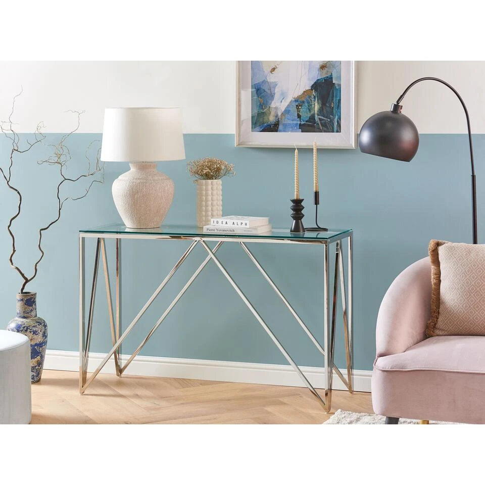 Glamour rechthoekige consoletafel. De elegante consoletafel in glamourstijl is perfect voor elke moderne woonkamer en hal. Het is gemaakt van hoogwaardig roestvrij staal voor stabiliteit en heeft een blad van gehard glas. Het glanzende frame met zijn geometrische vorm maakt de consoletafel tot een eyecatcher in elk interieur.