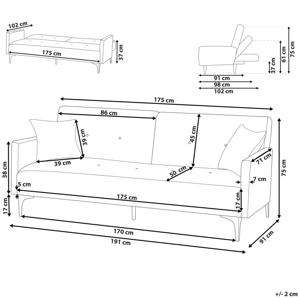 Belangrijkste eigenschappen: Zeer gemakkelijk te veranderen in een bed, Rugleuning verstelbaar in 3 posities, Traditioneel design met een moderne twist, Hoogwaardige kwaliteit stoffering, Verwijderbare kussenhoezen, Beschermdoppen voor oppervlaktebescherming