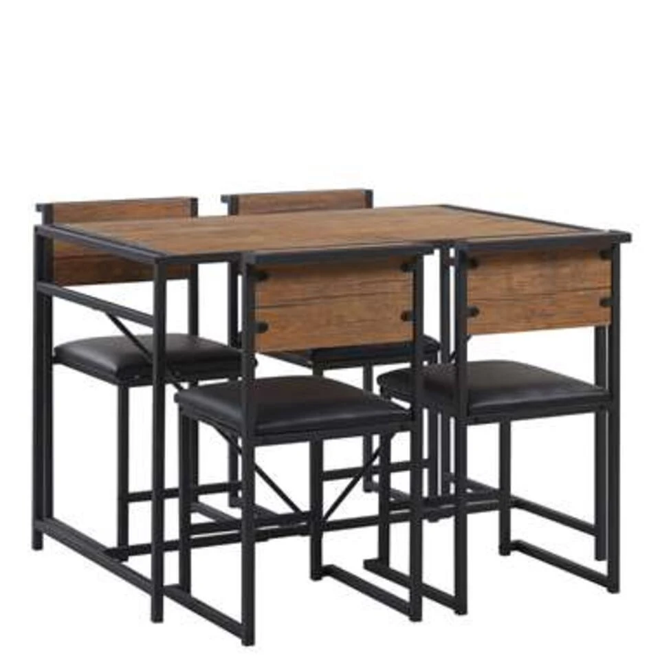 Moderne eetset met 4 stoelen. Deze 5-delige eetset in industriële stijl zal uitstekend uitkomen in traditionele en moderne interieurs. Het ontwerp is in perfecte harmonie en de stoelen hebben een comfortabele zitting met brede rugleuning. Door het compacte formaat en de mogelijkheid om de stoelen onder het tafelblad te plaatsen, zal de set ook een uitstekende oplossing zijn voor kleine eetkamers.