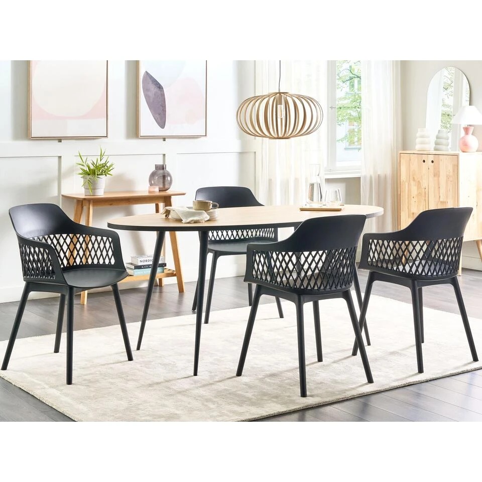 Moderne accentstoelen. Voeg een vleugje minimalistische elegantie toe aan je keuken of eetkamer met deze set stoelen. Ze zijn gemaakt van synthetisch materiaal waardoor ze stevig en gemakkelijk schoon te maken zijn. Perfect zijn voor dagelijks gebruik. Ze zijn niet alleen visueel aantrekkelijk, maar ook comfortabel dankzij hun ergonomisch ontwerp. De stoelen zijn licht van gewicht en gemakkelijk te verplaatsen, waardoor ze voor verschillende doeleinden kunnen worden gebruikt. Zo zijn ze een praktische toevoeging aan elke ruimte. Of je nu een dinerfeest organiseert of gewoon geniet van een maaltijd met je dierbaren, deze stoelen bieden een stijlvolle en comfortabele zitoplossing.