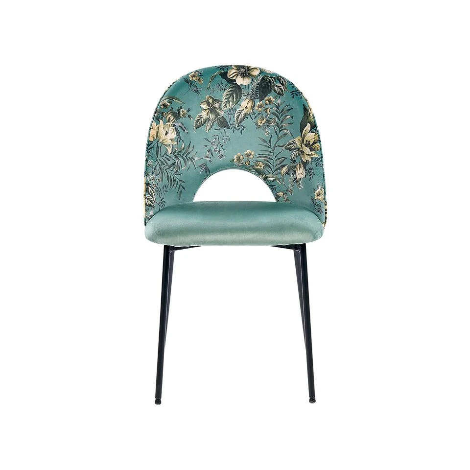 Elegante stoel met fluweelachtige bekleding. De zwarte poten staan prachtig bij de zachte fluwelen bekleding in een moderne groentint en maken van deze stoel een designstuk bij uitstek. Daarnaast geeft het bloemmotief op de rugleuning een decoratief effect in je kamer. Deze stoel staat mooi bij klassieke interieurs, en kan naar wens worden omringd met lichte of donkere decoratieve accessoires.