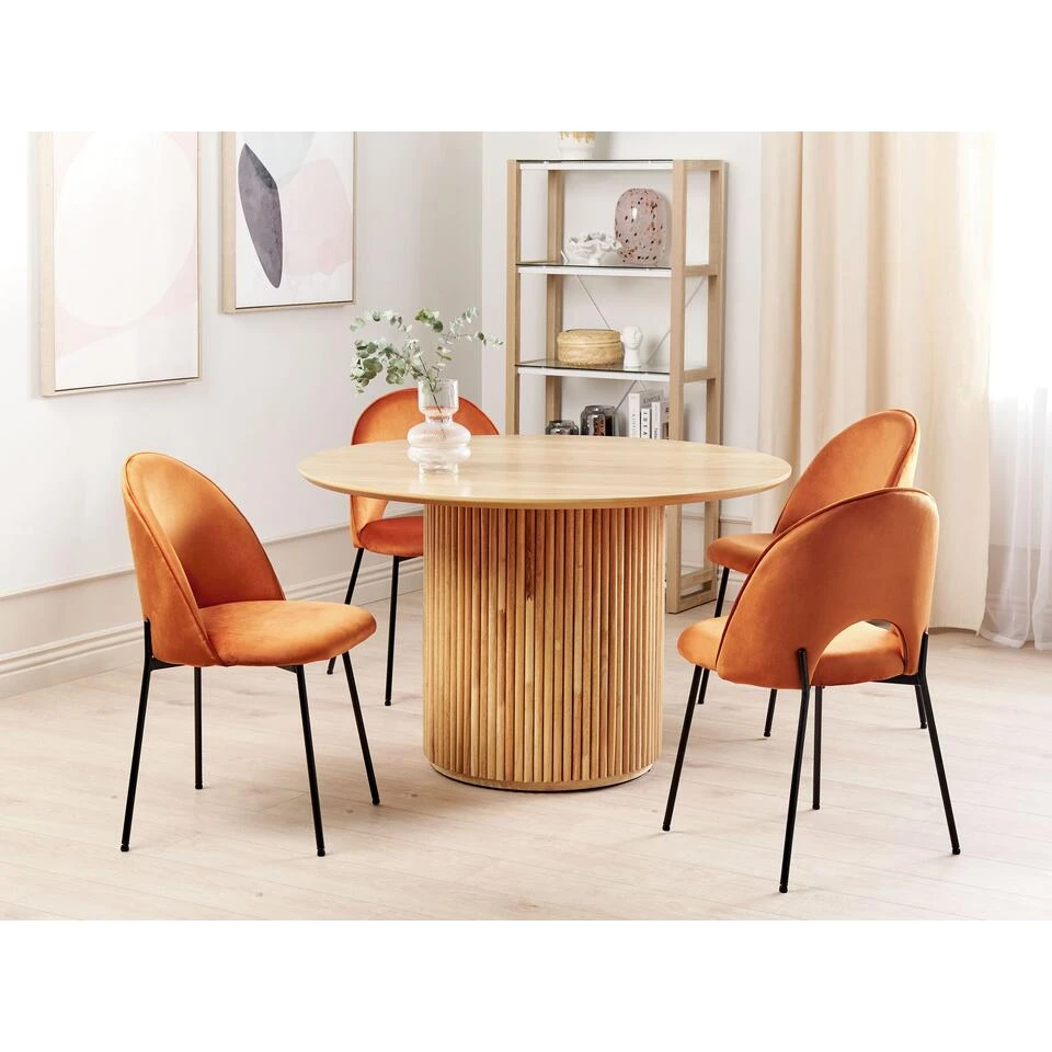 Twee retro eetkamerstoelen. Breng een retro vibe in je interieur met deze set stijlvolle stoelen. Ze zijn dik gewatteerd en gestoffeerd met aangenaam aanvoelend fluweel en hebben vier dikke zwarte metalen poten die karakter toevoegen aan elke eethoek. Gecombineerd met een gestroomlijnde rugleuning met een decoratieve opening, onderstreept het zowel moderne als traditionele arrangementen.