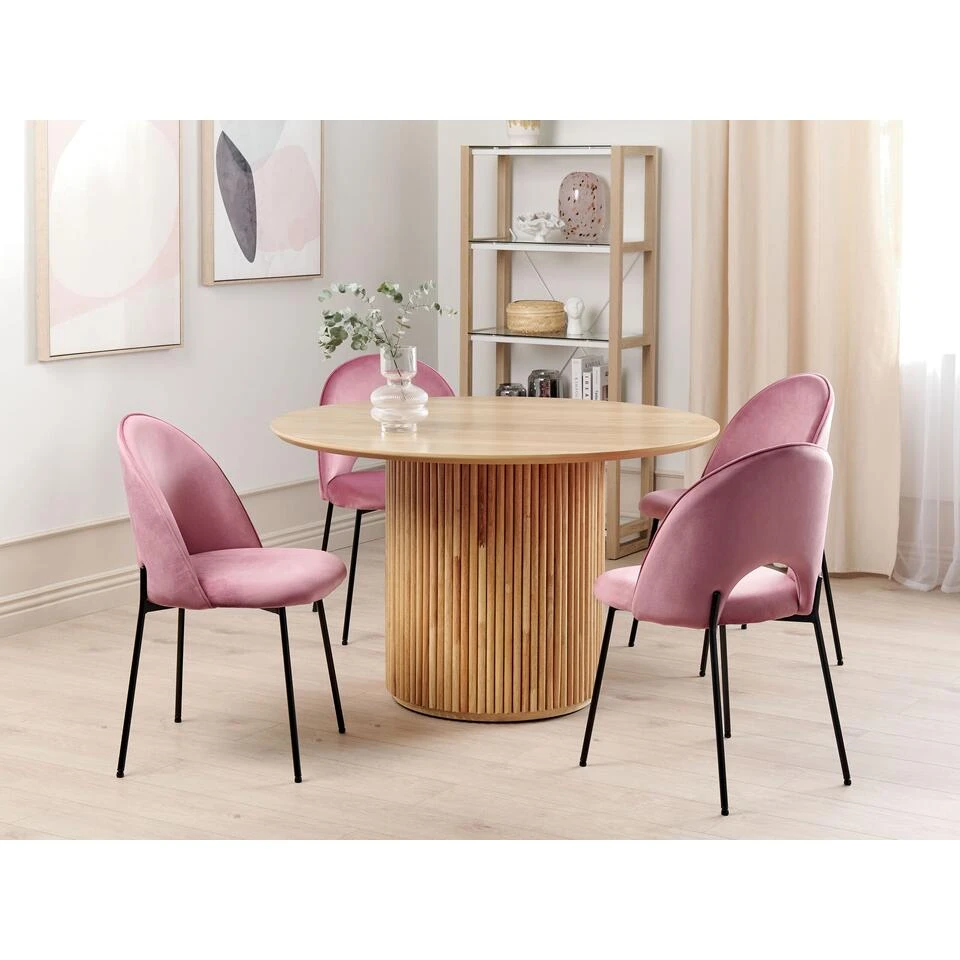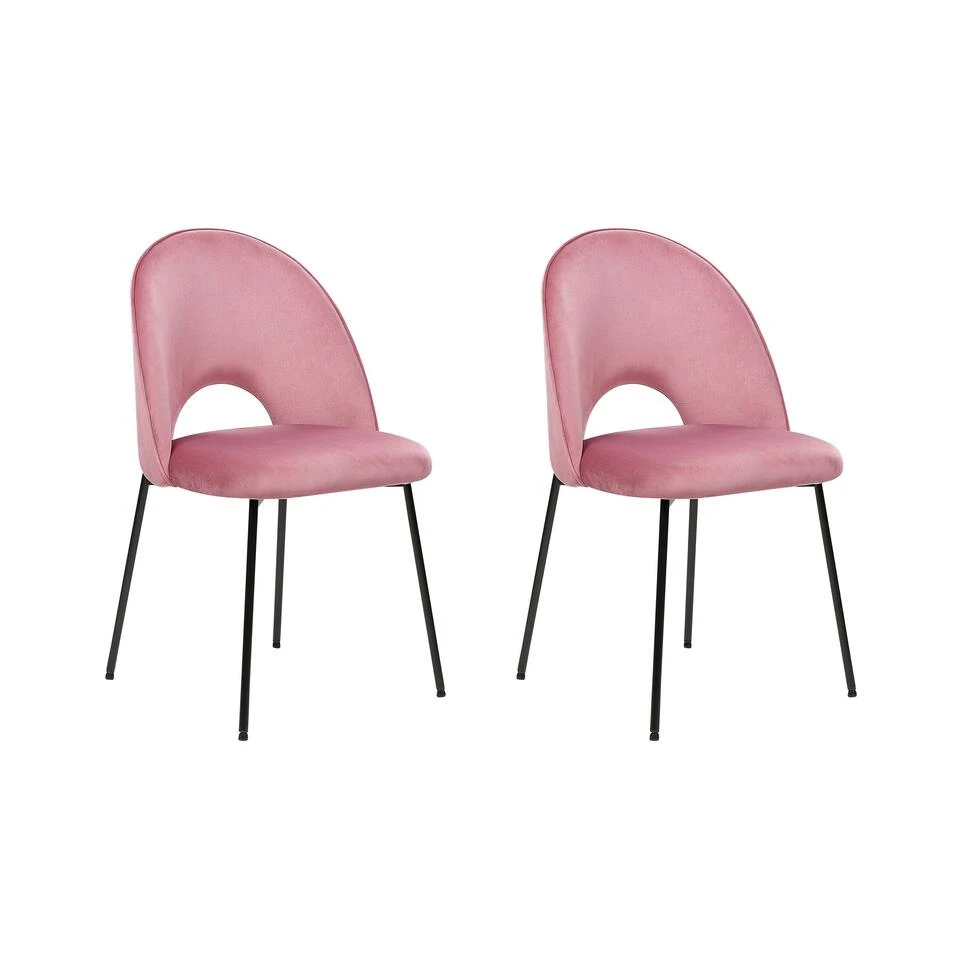 Twee retro eetkamerstoelen. Breng een retro vibe in je interieur met deze set stijlvolle stoelen. Ze zijn dik gewatteerd en gestoffeerd met aangenaam aanvoelend fluweel en hebben vier dikke zwarte metalen poten die karakter toevoegen aan elke eethoek. Gecombineerd met een gestroomlijnde rugleuning met een decoratieve opening, onderstreept het zowel moderne als traditionele arrangementen.