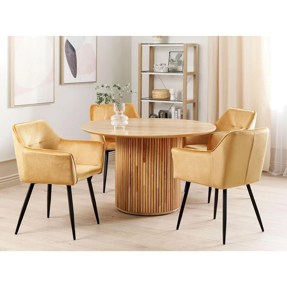 Eetkamerstoel met metalen poten en fluwelen hoes in set van 2. Het minimalistische en tegelijkertijd luxueuze ontwerp van deze stoelen maakt indruk met een tijdloze uitstraling. De strakke lijnen van de stoelen worden geaccentueerd door de fluwelen bekleding. De textuur en de kleur brengen elke kamer tot leven. Afgerond met slanke metalen poten past de stoel perfect bij elke inrichtingsstijl.