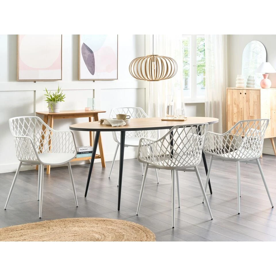Set klassieke Scandinavische eetkamerstoelen. Deze stoelen zijn perfect voor elke keuken of eetkamer, geïnspireerd op de Scandinavische stijl. De zitting en rugleuning van kunststof zijn zeer onderhoudsvriendelijk en passen dankzij hun karakteristieke vormgeving ook perfect in moderne interieurs. De slanke poten zijn gemaakt van duurzaam metaal in een lichte houtkleur, waardoor de stoelen een natuurlijk accent krijgen.