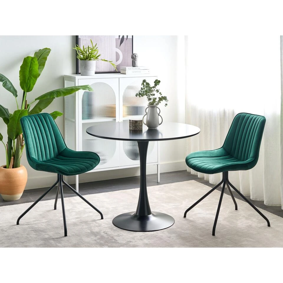 Set van gestoffeerde stoelen. Vernieuw je eetkamer met deze set gestoffeerde stoelen en creëer een glamoureuze sfeer. De stoelen zijn gemaakt van duurzaam fluweel, waardoor beide stoelen zacht zijn. Dankzij hun kruisvormige basis van staal zijn ze ook zeer stabiel. De gestoffeerde rugleuningen en licht gebogen zittingen zullen zeker de aandacht trekken en garanderen het hoogste comfort tijdens het dineren.