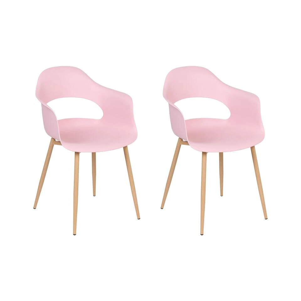 Stijlvolle eetkamerstoelen in een set van 2. Als je droomt van een moderne eetkamer met een vleugje Scandinavische stijl, dan zijn deze stoelen de juiste keuze. Ze zijn ook geschikt voor een ruime keuken of woonkamer en staan geweldig aan een vierkante tafel en vormen zo een ontbijthoek voor jou en je wederhelft. Het lichaam van sterk plastic maakt de stoel duurzaam en zal lang boeien met zijn roze kleur, en de metalen poten met een afwerking die hout imiteert verrijken hem met een minimalistisch accent.