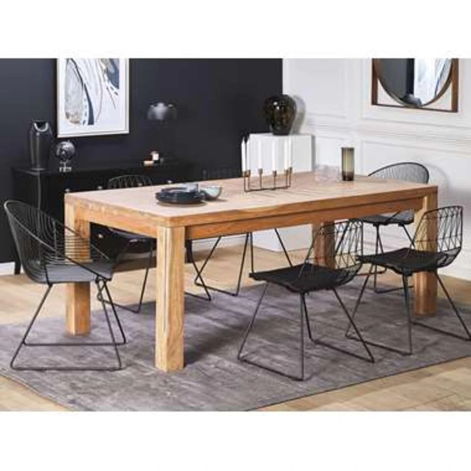 Handgemaakte eetkamertafel van acaciahout. Deze grote eettafel met 6 zitplaatsen is perfect voor ruime eetkamers of woonkamers. Met zijn natuurlijke uitstraling past het in industriële, rustieke en traditioneel geïnspireerde interieurs en als het goed verzorgd wordt, zal het er jarenlang goed uitzien. Dankzij de natuurlijke kleur en het eenvoudige ontwerp past deze tafel bij elke eetkamerstoel of -kruk.