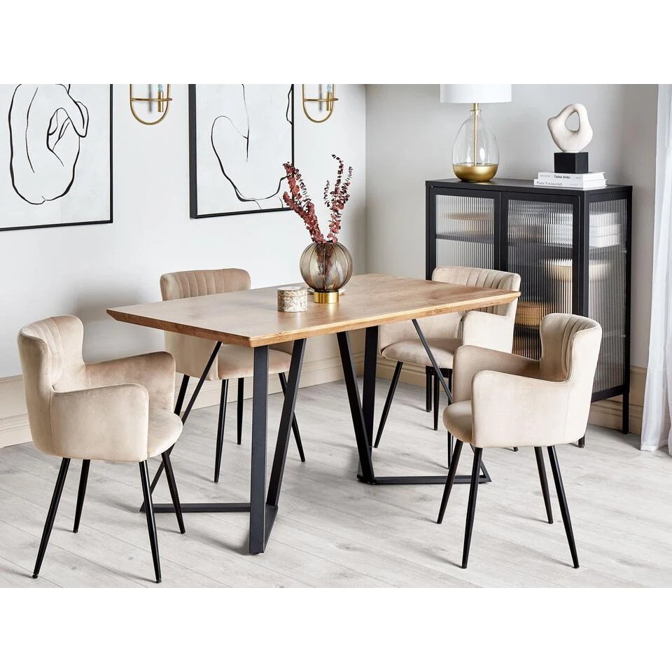 Moderne eettafel met geometrische poten. Deze eettafel geïnspireerd op industriële stijl maakt indruk met zijn vorm. Het heeft geometrische poten die de constructie van de tafel solide en duurzaam maken. Het licht houten tafelblad is gemaakt van hoogwaardig materiaal en is ruim genoeg voor maximaal 6 personen. Geef je eetkamer een modern tintje met deze tafel en geniet van maaltijden aan deze uniek ogende tafel.