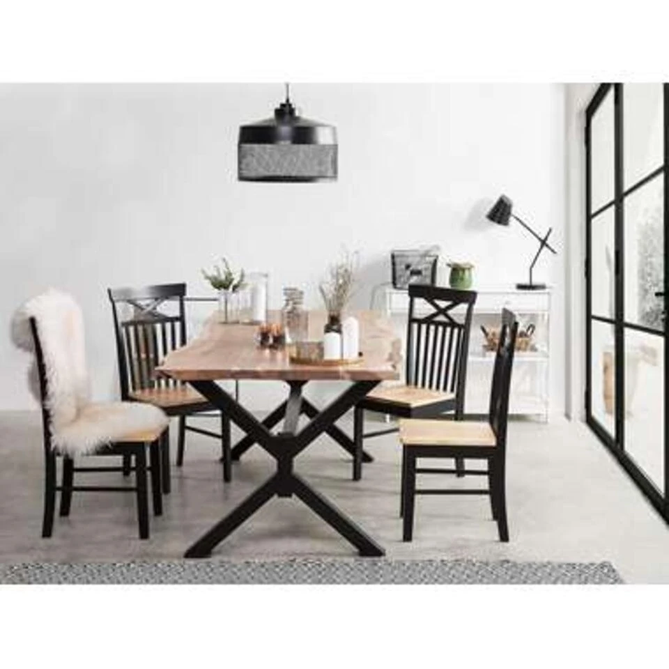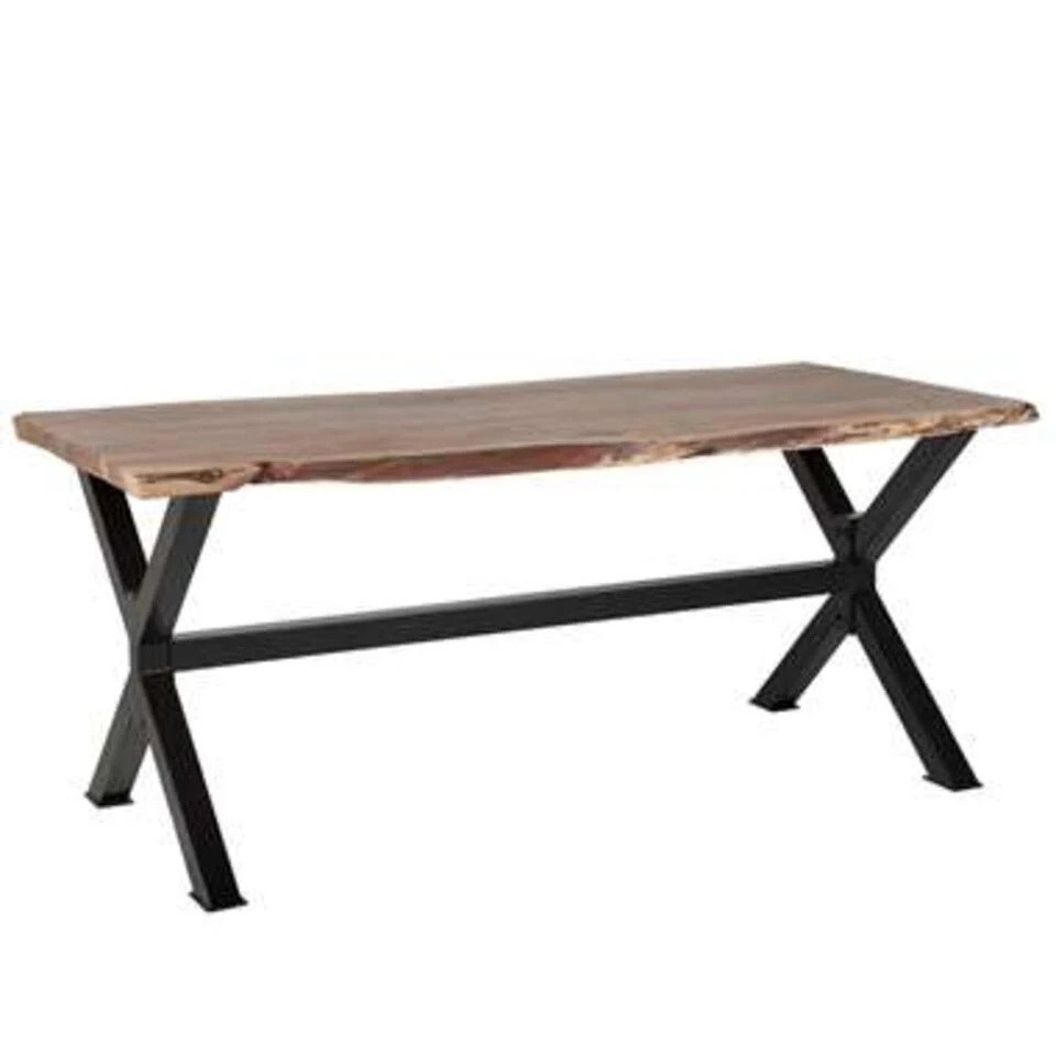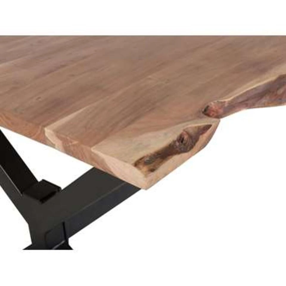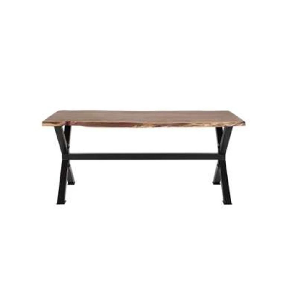 Industriële eettafel van acaciahout. Deze tafel een geweldige aanvulling op elke eetkamer die indruk maakt vanwege zijn constructie en ontwerp. Deze tafel is geïnspireerd op rustieke en boho-stijlen, met zichtbare houtnerven op het tafelblad, en past ook goed in moderne of Scandinavische decors. Het oppervlak biedt veel ruimte en comfort tijdens het eten, en het ontwerp zelf is niet alleen functioneel maar ook een mooi accent in elk interieur. Omdat het hout uit één stuk wordt gezaagd, heeft elk tafelblad een unieke vorm.