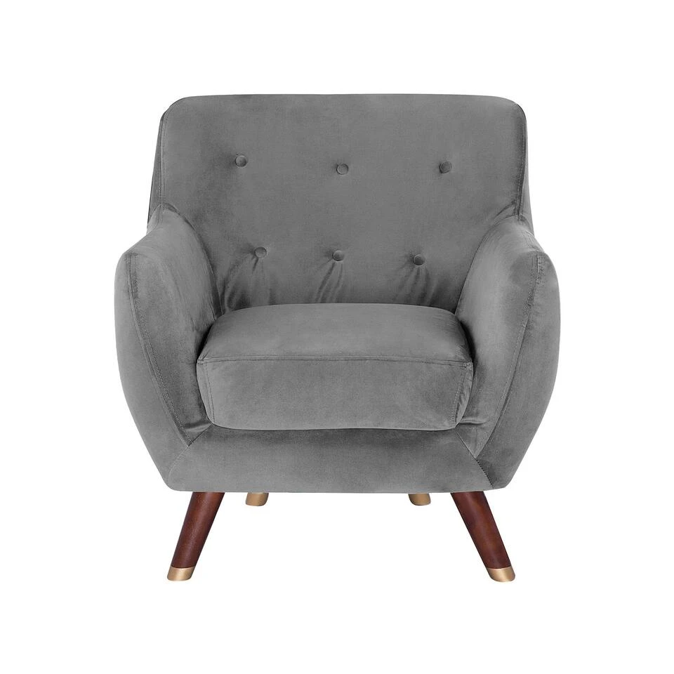 Fauteuil van retro fluweel in grijs. Ontworpen in een prachtig geprofileerde vorm, zorgt deze fauteuil voor uiterst comfortabel loungen. De geknoopte rugleuning, gebogen armleuningen en schuine houten poten zijn geïnspireerd op de retro-vormen. Het stuk is volledig gestoffeerd in een slijtvaste polyester fluweel. Het zitkussen is royaal opgevuld met schuim voor het hoogste niveau van comfort en heeft een afneembare hoes waardoor het gemakkelijk te verzorgen is.