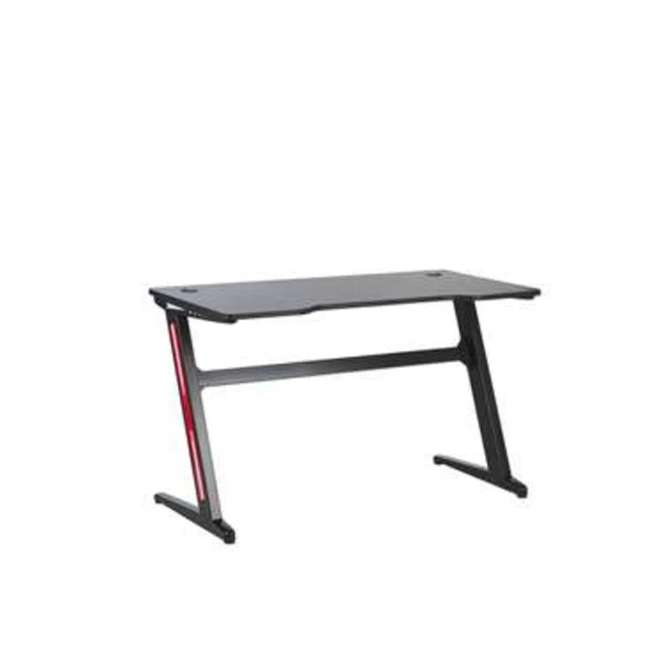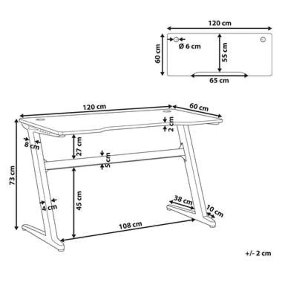 Uniek game bureau met innovatieve constructie. Met dit futuristische gamebureau kan je je competitieve gaming sessies effectief en comfortabel maken. Alle game-apparatuur kan op het ergonomisch vormgegeven zwarte bureaublad worden geplaatst en alle kabels kunnen worden weggewerkt dankzij de handige kabelopeningen. De innovatieve LED RGB-verlichting is een prachtige aanvulling op het hele ontwerp en kan met de bijbehorende afstandsbediening naar wens worden aangepast. De trendy gevormde metalen poten met een extra dwarsbalk staan garant voor een uitstekende stabiliteit van de robuuste constructie.