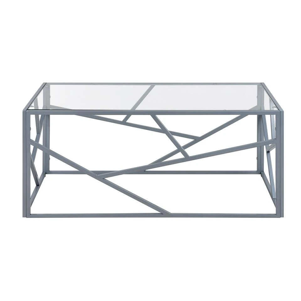 Stijlvolle salontafel in zilver. Dankzij zijn moderne en industrieel geïnspireerde design zal deze salontafel zeker niet onopgemerkt blijven. Het geometrische metalen frame en het glazen tafelblad creëren een geweldige combinatie – een briljante fit voor elke hedendaagse woonkamer of kantoor. De tafel komt met beschermende kussens, zodat u hem kunt verplaatsen zonder de vloer te beschadigen.