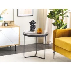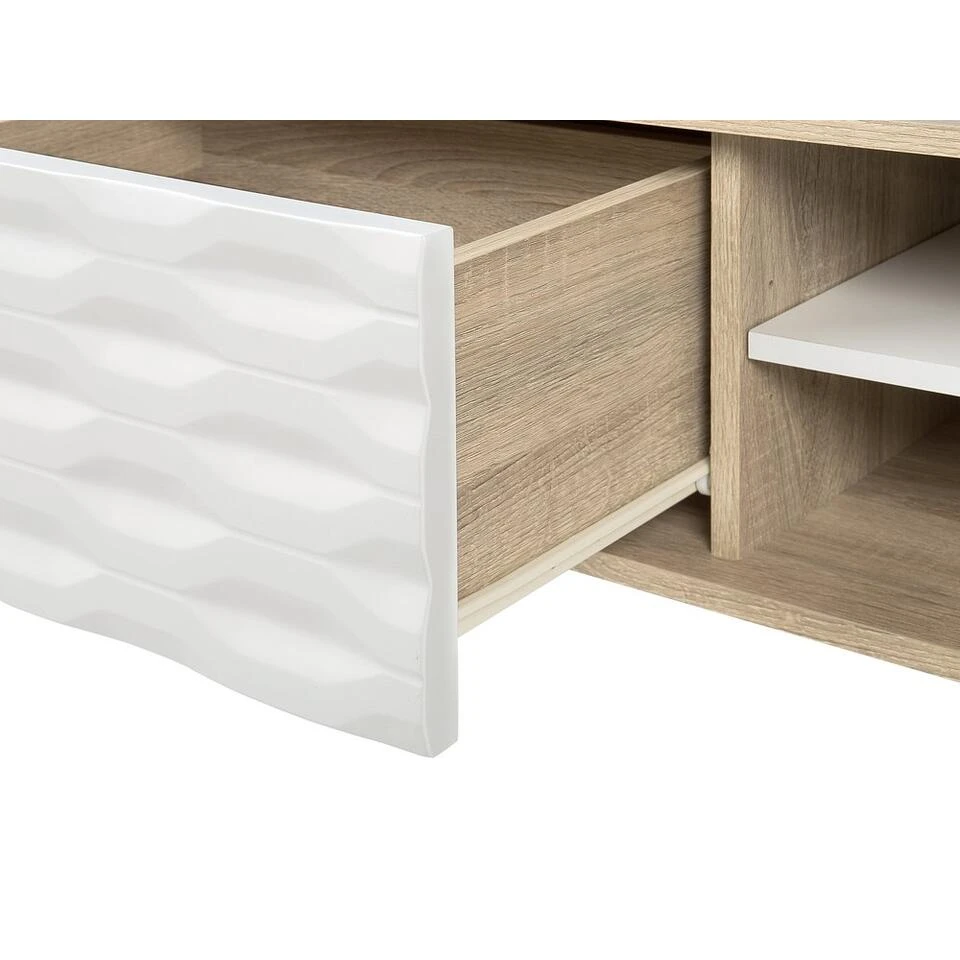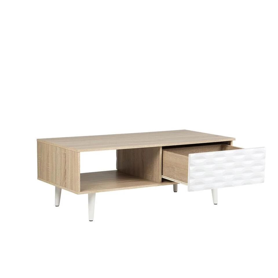 Robuuste salontafel met industrieel ontwerp. Een salontafel die een aangename lichtheid uitstraalt in de kamer met zijn moderne stijl. Naast het open vak heeft het ook een afgesloten lade waar je kleine spullen in kunt opbergen. Het bovenoppervlak is perfect voor een kop koffie, de afstandsbediening en decoratie.