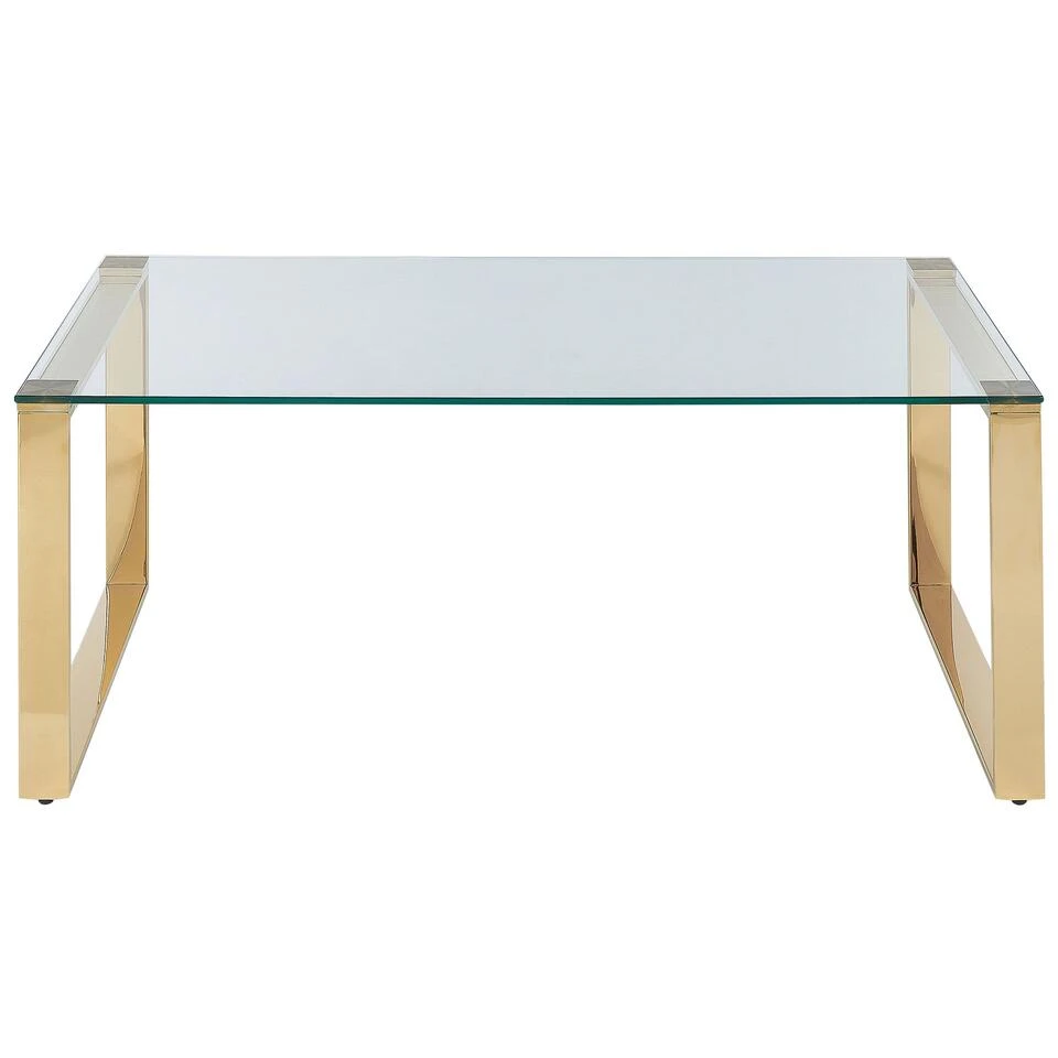 Moderne stalen salontafel met glazen tafelblad. Geef je woonkamer of hal een upgrade door deze elegante en moderne salontafel toe te voegen. Het is gemaakt van glas met een roestvrij staal frame waardoor het stevig en duurzaam is. Het is ideaal om accessoires of decoraties op te zetten. De tafel past perfect bij industriële en minimalistische interieurs met witte, grijze of zwarte meubels.