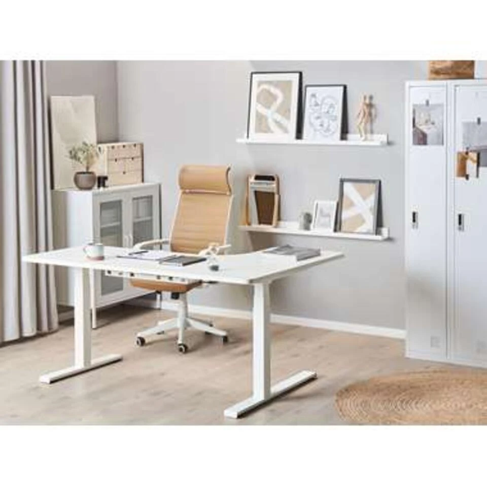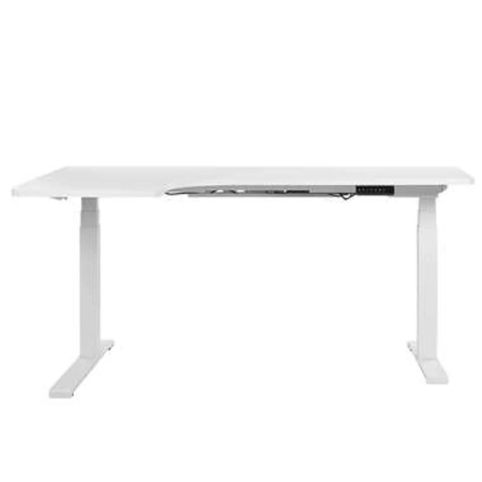 Elektrisch in hoogte verstelbaar bureau in wit. Personaliseer jouw eigen werkplek volgens jouw individuele behoeften. Met een elektrisch in hoogte verstelbaar tafelframe met telescopische poten van wit, gepoedercoat staal, kun je jouw werkplek in een handomdraai ergonomisch inrichten. Dit geeft je de mogelijkheid om zowel zittend als staand te werken. Dankzij de krachtige elektrische aandrijving kun je jouw bureau in slechts enkele seconden omtoveren in een praktisch stabureau. Met de geheugenfunctie kun je drie verschillende hoogtes opslaan. Het stevige, blad heeft een duurzame melamine coating. De brede basis van het frame zorgt voor maximale stabiliteit. Deze gecombineerde zit/sta werkplek is een verstandige investering in jouw gezondheid en productiviteit!